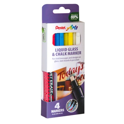 The Pentel Jumbo Semi-Permanent Wet-Erase Liquid Glass&Chalkboard Marker (Pack of 4, Assorted Colours) features a jumbo chisel tip and semi-permanent ink ideal for bold, weather-resistant writing on chalkboards or glass, perfect for indoor/outdoor notices, menus, and artworks. Easy to remove with a damp cloth.