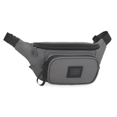 30 cm x 13 cm x 5 cm waist bag made of polyester and faux leather details. Main compartment with zip closure. Front pockets and a pocket on the back, both with zipper for easy access to accessories and gadgets. Adjustable strap to fit your waist better. Made with water resistant materials
