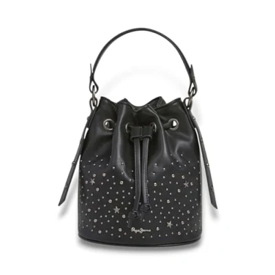 Ivy Cluster bucket bag with drawstring closure, inner pocket with zip closure Different shapes of metallic studs, short handle, long adjustable and removable shoulder strap and metallic classic logo on back 100Percent Polyurethane
