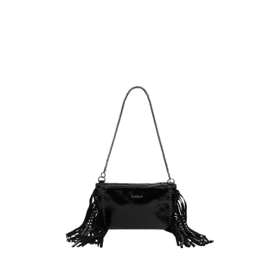 Ursula Rock small crossbody bag with flap, lateral fringes Round metallic studs, zipper closure, customized metallic pullers and doghooks Short chain handle and adjustable webbing strap, metallic logo plate on the front