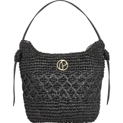 Straw hobo bag with handles Inner pocket Magnetic closure Metallic monogram logo on front panel
