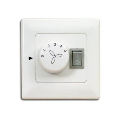 Dimensions and technical details Design - synthetic material housing, colour white, rotary switch with 4 fan speeds and dip switch. Functionality - 4 fan speeds and off. On / off switch for ceiling fan light. The delivery includes a surface-mounted housing that is installed on the wall. (Screws are included in the delivery). It is also possible to install this control in standard flushed-mounted sockets (single). Operation - The device uses micro capacitators to ensure speed control without buzzing sounds. 2 separate phases are required to control the motor and the light (1x phase motor and 1x phase light). Model - Delivery includes a surface-mounted housing. Also fits standard single flushed-mounted sockets. Compatibility - Suitable for ceiling fans with a motor wattage of up to 150 Watt and a power consumption of the light of up to 400 Watt.