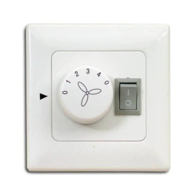 General description The wall switch for ceiling fans with lighting is designed for easy control of fan speed and lighting. It features a white housing made of synthetic material and includes a rotary switch for four rotation speeds, along with an on/off flip switch for the lighting. This switch is compatible with standard flush-mounted sockets. Technical specifications Dimensions: Standard flush-mounted size Material: Synthetic Rotation speeds: 4 Motor performance: Up to 150 Watt Lighting power consumption: Up to 400 Watt Compatibility and accessories Compatible with all conventional flush-mounted sockets as a single switch Screws included for installation Installation Can be installed in standard flush sockets (single flush socket) Requires two separate phases: one for the motor and one for the lighting Usage Controls ceiling fan motor speed Controls lighting on/off