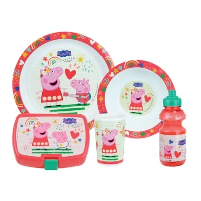Peppa Pig Children's Dish Set with 1 x 16 cm Deep Plate, Plate Diameter 22 cm, 220 ml Glass, 350 Bottle and Snack Box Reusable Tableware, Pink