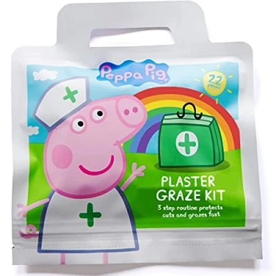 Peppa Pig Childrens Plaster Graze Kit / x22 Units 6 Wound Wipes 16 Plasters in 3 Sizes/Latex Free/Hypoallergenic/Wash Proof/Breathable/CE Certified/Resealable Pouch for Days Out.