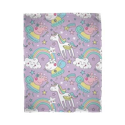 OFFICIAL PRODUCT: Officially licensed by Peppa Pig, this fleece blanket features a repeating pattern of Peppa Pig and Suzy Sheep as fairies, with unicorns and rainbows on a purple background VERSATILE: Ideal for the winter months, this warming fleece blanket is great for lounging on the sofa on movie night, keeping you warm when working from home or doing homework, wrapped up while gaming, and as an extra layer on cold winter nights TRAVEL READY: This lightweight fleece blanket can be compactly rolled or folded up to a small size, making it great for travel, car journeys, camping, or just around the rooms of your house EASY CLEANING: The blanket is washing machine and tumble dryer safe, so in case of spills, or just when it needs freshening up, simply throw the blanket in the wash without worry MEASUREMENTS: Can be folded up and stored while taking minimal space, but large enough to keep you covered, measuring 100 x 150cm