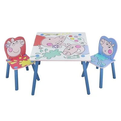 OFFICIALLY LICENSED: Our officially licensed Peppa Pig table and chair set includes a square table and 2 chairs. The tabletop has a high quality print of Peppa and George painting, and the two seats feature Peppa and George on red and blue backgrounds GET CREATIVE: Perfect for arts and crafts, whether it’s making and building, or when your child is just colouring in and practicing their writing EASY CLEAN: Made from durable MDF with a high quality print, this Peppa Pig table and 2 chair set has wipe clean surfaces on the chair seats and the table top EASY ASSEMBLY: Easy to assemble with all the fixings and step by step instructions included. Once assembled the table and chairs are sturdy, while the chairs are light enough for even young children to put away MEASUREMENTS: When assembled the table measures 45cm x 63cm x 63cm (HxDxW) and the chairs measure 52.5cm x 29.5cm x 29cm (HxWxD). Suitable for ages 18 months to 5 years approximately