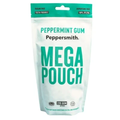 PEPPERSMITH: Naturally Tasty, Feel Good Treats. Delicious, premium mints, chewing gum and pastilles made with 100% natural flavours and thoughtfully sourced ingredients that are actively good for you! We use proper British mint and instead of sugar or chemical alternatives we use a clever little plant based sweetener called Xylitol to sweeten our tasty treats. Founded by the folks that brought innocent smoothies to the world, we're turning confectionery on its head, one mint at a time! MINI BUT MEGA PEPPERMINT GUM: Your fave Peppermint Xylitol Gum but in a mega sized pack! We take pride in sourcing mint from a beautiful farm in Hampshire and once the mint is harvested each year, it’s distilled into the very best pure peppermint oil you can get. Only the good stuff here folks. That's what gives our products their banging, refreshing, mintylicious flavour. WHAT EVEN IS XYLITOL: We use 100% plant based Xylitol to sweeten our mints, which actively cleans your mouth, making them good for your teeth. We're even recommended by dentists and approved by the Oral Health Foundation. Its natural properties are what make our tasty treats so good for you. Aspartame Free. HEALTHIER THAN EVER: Each Mega Pouch is bursting with a mega 220 pieces of sugar free chewing gum. All Peppersmith products are sugar free, vegan friendly, vegetarian, gluten free, GMO free, palm oil free and nut free. And totally guilt free too... Have we convinced you yet? If this flavour's your fave, head over to our store and get yourself a bulk buy! Or if you fancy something less chewy, give our sugar free mints a try. IMPROVE ORAL HEALTH: Xylitol kills up to 75% of the bad bacteria in your mouth, helps to reduce plaque and help to improve oral health.