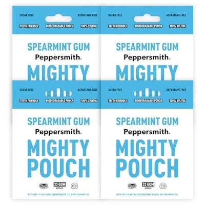 Peppersmith British Spearmint Gum 100% Plant Based Xylitol Breath Freshener Sugar Free Benefits Oral Health Mighty Pouch Pack of 4