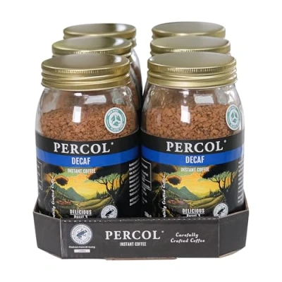 Percol Delicious Decaf Instant Coffee (6x100g), 100% Hand Picked Arabica Beans, Freeze Dried, Rich & Velvety Smooth, Strength 3, Single Origin, Sustainable, Recyclable