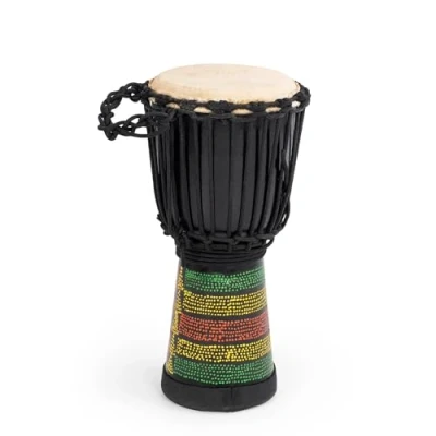 Tough and strong - ideal for the classroom Each drum hand-painted with traditional West African kente cloth design Handcrafted from a single piece of sustainably sourced mahogany Natural goatskin head with pre-stretched nylon rope tuning Superior third metal ring system to stop the skin from slipping