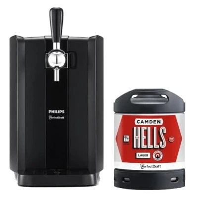 The PerfectDraft Black Phillips machine is a counter-top machine that chills six-litre kegs of beer down to a precise 3°C. This package includes 1 PerfectDraft Black beer dispenser and 1 6 litre keg of Camden Hells, Alc 4.6% Vol. Fresh, cold draught beer at home: the PerfectDraft Philips is a beer dispensing system designed for you to enjoy a glass of self-poured beer in the comfort of your home; For the freshest possible taste: LCD display with temperature and volume indication shows when your beer is at the target temperature of 3°C (12-hour cooling period that is guaranteed stable performance in temperatures up to 31°C, beer stays fresh and bubbly for up to 30 days) Discover the perfect tap: Designed to maintain quality and pour the beer the way the brewer intended - with a real tap handle