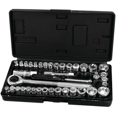 Ratchet, extension bar, 1/4" spinner handle, adaptor and more. 1/4" and 3/8" dr. socket sizes: 5/32" to 3/4" and 4 mm to 17 mm. Sturdy blow molded case.