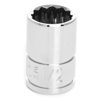 3/8" Drive 12-Point Socket, 1/2" Socket openings are designed to reduce fastener rounding. Chrome vanadium alloy steel construction for strength and durability. Polished nickel chrome plated finish resists corrosion. Large stamping for quick identification.