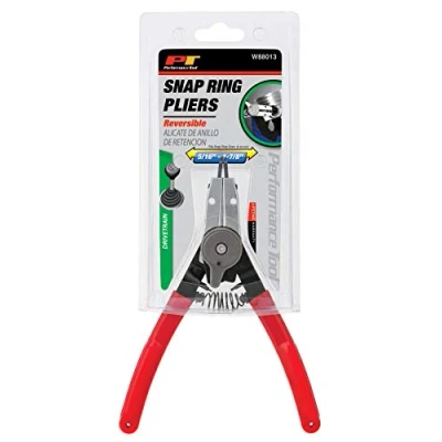 VERSATILE DESIGN: The Performance Tool W88013 Reversible Snap Ring Pliers feature a unique design that easily switches from internal to external operation, making it a versatile tool for any job. COMFORTABLE GRIP: The cushioned grips on these snap ring pliers provide comfort during use and feature storage for spare tips, so you always have them at hand when you need them. EASY TIP CHANGE: The included hex key makes changing tips on these pliers easy and hassle-free. WIDE RANGE OF APPLICATIONS: With internal rings ranging from 7/8 to 1-7/8-Inches and external rings ranging from 5/16 to 1-7/8-Inches, these snap ring pliers can be used for a wide range of applications. SPACE-SAVING DESIGN: With four different tips included (1.8mm and 1.2mm in both straight and 90-degree angles), these snap ring pliers take the place of four different tools in your toolbox, saving you space and money.