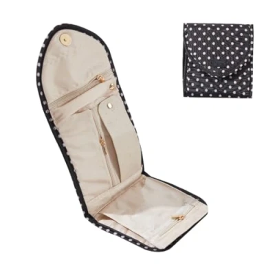 Periea ‘Cleo’ Travel Jewellery Organiser Roll Foldable Jewelry Case for Journey Rings, Necklaces, Bracelets, Earrings (Black with White Polka dots, Small)