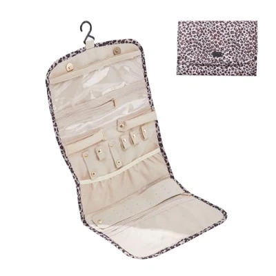 Periea ‘Cleo’ Travel Jewellery Organiser Roll Foldable Jewelry Case for Journey Rings, Necklaces, Bracelets, Earrings (Gold Leopard, Large)