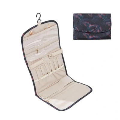 Periea ‘Cleo’ Travel Jewellery Organiser Roll Foldable Jewelry Case for Journey Rings, Necklaces, Bracelets, Earrings (Green Pink Fern, Large)