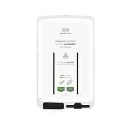 Dispenses tampons and sanitary pads. Lightweight and compact. Secured with a key lock mechanism (1 key supplied). Two sight windows to monitor fill levels. Features a direct printed sustainability message. 100% recyclable.