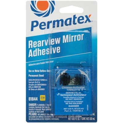 2 part rear-view mirror adhesive and activator permanently remounts mirrors to windshields Achieves handling strength in second, mirror mounting strength in 15 minutes Single use only ODC free Not designed for plastic buttons