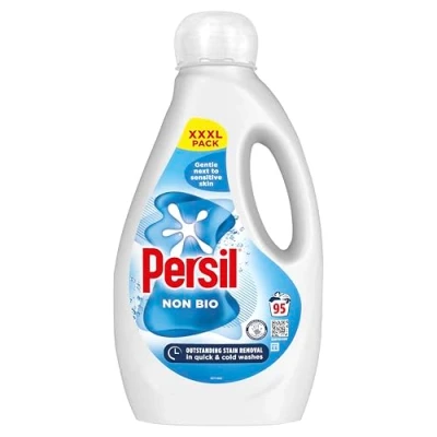 FabFindsTrusted by families and gentle on sensitive skin, Persil Non Bio Liquid Detergent offers tough stain removal without irritation. This 95-wash bottle is perfect for everyday laundry with a skin-friendly touch.. 95 washes per bottle concentrated non-biological formula. Dermatologically tested gentle on sensitive skin and baby clothes. Effective stain removal, even at 30°C. Fresh clean scent with no harsh residues. Ideal for both white and coloured fabrics