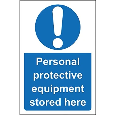Personal protective equipment PPE stored here safety sign Self adhesive sticker 400mm x 300mm Digitally printed and laminated for extra durability Remove backing film and apply to dry, smooth, oil free surface., Manufacturer: KPCM Display ltd