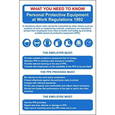 Personal Protective Equipment Regs (PPE) Poster Sign Self adhesive vinyl 300mm x 200mm Digitally printed and laminated for extra durability Remove backing film and apply to dry, smooth, oil free surface.