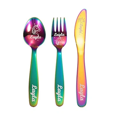 Personalised 3PCS Children Unicorn Cutlery Set with Customised Patterns and Names Stainless Steel Flatware Safe Utensilsfor Kids Toddler Ideal for Kitchen Home Spoon+Fork+Knife