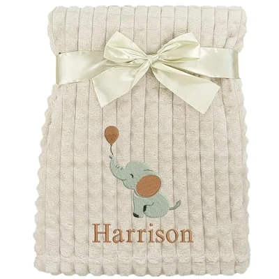 BABY EMBROIDERED ELEPHANT BLANKET: Wrap little ones in warmth and love with our Personalised Baby Elephant Blanket. Crafted with care, this soft blanket features various design colours of an adorable elephant. This personalised baby blanket is perfect for providing comfort, warmth, with a gentle touch. SOFT & WARM FLEECE BLANKET: This baby blanket is made from quality fleece fabric material, being soft and gentle on babies skin. It is available in many colours including adorable pink, blue, grey, white and beige, perfect to suit many choices. PERFECT GIFT IDEA: Searching for the perfect personalised baby gift? Look no further! Our Personalised Baby Elephant Blanket makes an excellent choice for newborn gifts, baby showers, baby announcements, birthdays and Christmas. This beautiful, personalised blanket not only provides comfort but also serves as a cherished keepsake that will be treasured for years to come. PERSONALISE THE ELEPHANT BLANKET: You can choose to have no name or embroidered with a name and elephant, in a colour of your choice, making them unique for baby and family. Baby Blanket Size: 90 x 75cm.