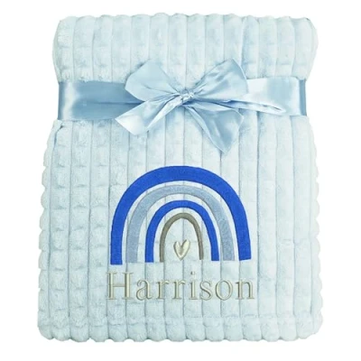 BABY EMBROIDERED RAINBOW BLANKET: Wrap little ones in warmth and love with our Personalised Baby Rainbow Blanket. Crafted with care, this soft blanket features various design colours of an adorable rainbow. This personalised baby blanket is perfect for providing comfort, warmth, with a gentle touch. SOFT & WARM FLEECE BLANKET: This baby blanket is made from quality fleece fabric material, being soft and gentle on babies skin. It is available in many colours including adorable pink, blue, grey, white and beige, perfect to suit many choices. PERFECT GIFT IDEA: Searching for the perfect personalised baby gift? Look no further! Our Personalised Baby Rainbow Blanket makes an excellent choice for newborn gifts, baby showers, baby announcements, birthdays and Christmas. This beautiful, personalised blanket not only provides comfort but also serves as a cherished keepsake that will be treasured for years to come. PERSONALISE THE RAINBOW BLANKET: You can choose to have no name or embroidered with a name and rainbow, in a colour of your choice, making them unique for baby and family. Baby Blanket Size: 90 x 75cm.
