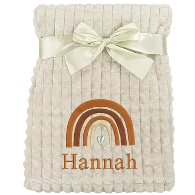 BABY EMBROIDERED RAINBOW BLANKET: Wrap little ones in warmth and love with our Personalised Baby Rainbow Blanket. Crafted with care, this soft blanket features various design colours of an adorable rainbow. This personalised baby blanket is perfect for providing comfort, warmth, with a gentle touch. SOFT & WARM FLEECE BLANKET: This baby blanket is made from quality fleece fabric material, being soft and gentle on babies skin. It is available in many colours including adorable pink, blue, grey, white and beige, perfect to suit many choices. PERFECT GIFT IDEA: Searching for the perfect personalised baby gift? Look no further! Our Personalised Baby Rainbow Blanket makes an excellent choice for newborn gifts, baby showers, baby announcements, birthdays and Christmas. This beautiful, personalised blanket not only provides comfort but also serves as a cherished keepsake that will be treasured for years to come. PERSONALISE THE RAINBOW BLANKET: You can choose to have no name or embroidered with a name and rainbow, in a colour of your choice, making them unique for baby and family. Baby Blanket Size: 90 x 75cm.