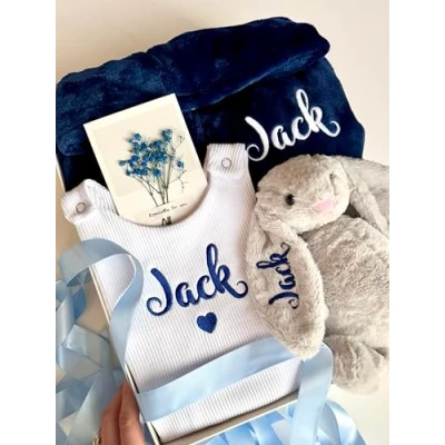 Personalized Touch: Each item in our baby gift set is delicately embroidered with the name or initials of your choice, adding a unique charm to your little one’s essentials. Versatile Color Options: Choose from a variety of soothing and joyful colors that perfectly complement any nursery theme, making it ideal for baby boy gifts and baby girl gifts. Optional Gift Box: Add a luxury see-through gift box to make your set extra special. The box is beautifully packaged with ribbon, so it arrives ready to give as a baby shower or newborn present. Each box is carefully protected with bubble wrap and an outer carton to ensure it reaches the recipient in perfect condition. Complete Gift Set: Includes a cuddly personalized bunny, a practical zip romper or dungaree, and a cozy robe, all beautifully packaged. Perfect for personalised baby gifts and baby essentials Perfect for Any Occasion: Ideal for baby showers, new baby gifts, and special celebrations. This set is designed to create lasting memories and be cherished for years to come.