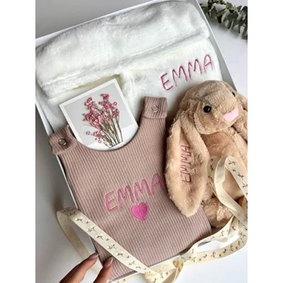 Personalized Touch: Each item in our baby gift set is delicately embroidered with the name or initials of your choice, adding a unique charm to your little one’s essentials. Versatile Color Options: Choose from a variety of soothing and joyful colors that perfectly complement any nursery theme, making it ideal for baby boy gifts and baby girl gifts. Optional Gift Box: Add a luxury see-through gift box to make your set extra special. The box is beautifully packaged with ribbon, so it arrives ready to give as a baby shower or newborn present. Each box is carefully protected with bubble wrap and an outer carton to ensure it reaches the recipient in perfect condition. Complete Gift Set: Includes a cuddly personalized bunny, a practical zip romper or dungaree, and a cozy robe, all beautifully packaged. Perfect for personalised baby gifts and baby essentials Perfect for Any Occasion: Ideal for baby showers, new baby gifts, and special celebrations. This set is designed to create lasting memories and be cherished for years to come.