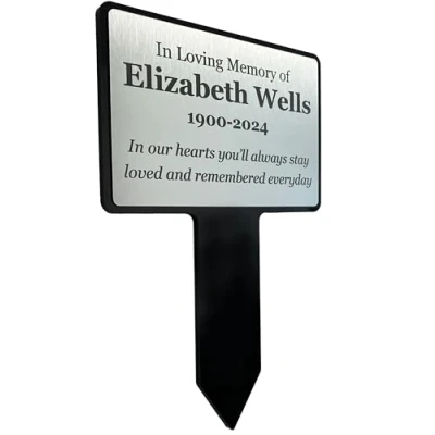 PERSONALISED MEMORIAL PLAQUE Create a meaningful tribute with custom engraved text. Personalise with a name, date or message to honour the memory of a loved one in a thoughtful and lasting way. SUITABLE FOR GARDEN OR GRAVE USE Designed with a sturdy stake, this memorial plaque can be placed in a garden, flower bed, memorial area or at a grave, offering a peaceful place of remembrance. DURABLE & WEATHER RESISTANT Made for outdoor use, the plaque is designed to withstand the elements, remaining clear and presentable in all seasons for long-term remembrance. BESPOKE, THOUGHTFUL REMEMBRANCE GIFT A touching memorial gift for family or friends following a loss. Each plaque is individually made to order, ensuring a unique and personal keepsake. AVAILABLE IN MULTIPLE FINISHES Choose from elegant gold or silver finishes to suit your preference. Clear engraving ensures your message is easy to read and beautifully presented. PERMANENTLY ENGRAVED FOR LASTING REMEMBRANCE Your personalised message is permanently engraved to create a lasting tribute that will not fade with outdoor use.