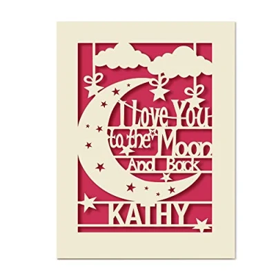 Elite design personalised papercut lover card, adorable for any name personalised love valentines gift. Personalised Happy Valentines Day Papercut Card, in house technology. Size: A5 (21 * 15 cm),Personalised with name. Laser-cut from a beautiful, excellent quality ivory card. Hand-finished with high quality coloured paper inlay for " I Love You to the moon and back " blessing handwriting.