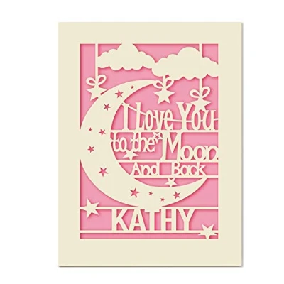 Elite design personalised papercut lover card, adorable for any name personalised love valentines gift. Personalised Happy Valentines Day Papercut Card, in house technology. Size: A5 (21 * 15 cm),Personalised with name. Laser-cut from a beautiful, excellent quality ivory card. Hand-finished with high quality coloured paper inlay for " I Love You to the moon and back " blessing handwriting.