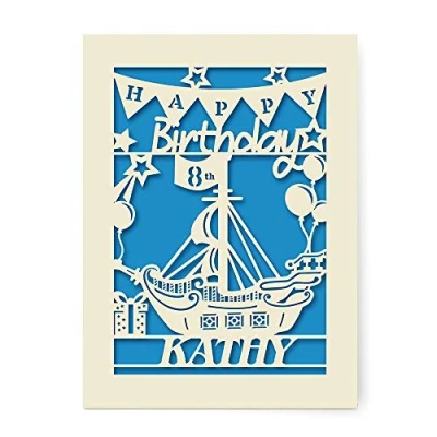 Personalised Birthday Card Paper Cut Happy with Sailboat Design Custom Gift Envelope Hand Finished in UK 3th 7th 12th 13th 18th (Blue)