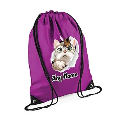 Personalised Butterfly on Cat face Hidden Funny Kitten Birthday Gift Drawstring Bag, PE Gym Kit, Swimming Rucksack. (Magenta)