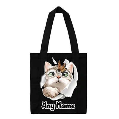 Personalised Butterfly on Cat face Hidden Funny Kitten Birthday Gift Shopping Shoppers Tote Bag (Black)