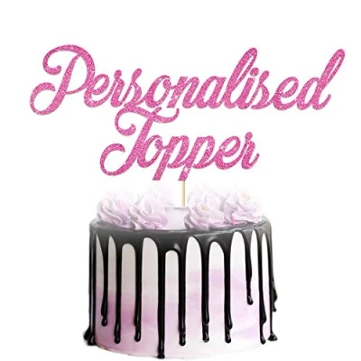 Personalised Cake Topper Custom Any Occasion Decorations Double Sided Glitter Card Text Customized Word Multicolour Birthday or Wedding Party Decoration (Pink)