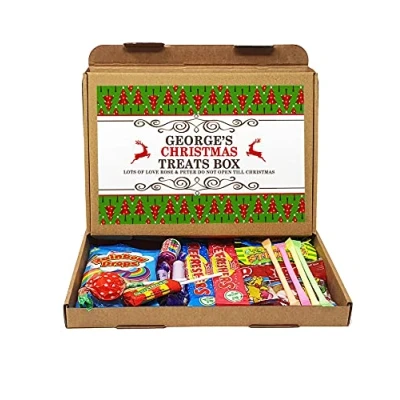Personalised Christmas Treats Sweets Box Kids Gift Hamper Retro Vegan Stocking Children Present Lockdown 2021 (Design 2: Non Vegan)