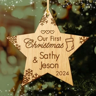 Beautiful laser cut and engraved Xmas tree decoration plaque, ideal to celebrate Christmas for newly-wed.... Size: Approx 9 x 9 cm, High-quality laser cut on 4mm strong cherry wood. Each Christmas bauble decoration is individually typeset and cut for you from 4mm strong cherry wood. With your names on, it makes a unique Christmas gift for newly-wed. Personalised Engraved Christmas Decorations are professionally Cut, Engraved & Finished, which makes a unique keepsake Decoration for Christmas. Please click on Customize now to enter your personalised names and year. (Note: Please note to check the personalised spelling.)