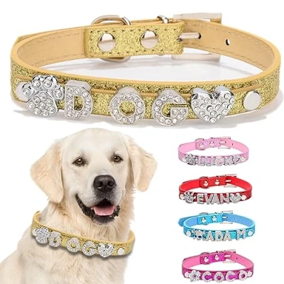 Personalised Dog Collar for Small Dog/Cat Collars with Name Puppy Cat BLING PU Leather Kitty Pets Middle Large Collar(Bling Gold,XS)