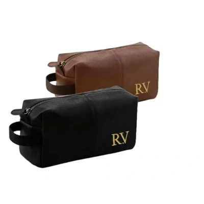 Personalised Embroidered Men's Leather Wash Bag with Strap, Black or Brown, Toiletry Initials
