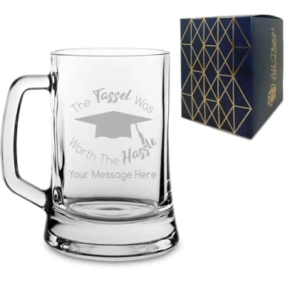 Mark the milestone of graduation with our personalised engraved 'The Tassel was worth the Hassle' beer mug � a thoughtful gift for the accomplished graduate! Featuring a set design, personalise it with their name or any heartfelt message to make a truly memorable gift for a meaningful way to celebrate their hard work. This glass holds up to 500ml/16.75oz, and measures 120mm high x 135mm wide. With a sturdy handle and a heavy base, this is a classic beer mug design, perfect for lager, craft beer, ales and more! Marked with our laser engraving system, the novelty design and your personalisation will be permanently inscribed on the glass, making a lasting gift that will be treasured forever. Your glass will arrive in a stunning gift box, ready to give straight to the recipient. We recommend washing your glass as soon as you receive it. This glass is dishwasher safe, and as the engraving is permanent, you won't have to worry about washing the design off. To customise your glass, simply click "Customise Now" on this page where you can add your personalised details and view a rough example on what the final result will look like! Please note: Personalised details will be copied as they have been submitted, so please double check for spelling errors!, Manufacturer: CNC Group