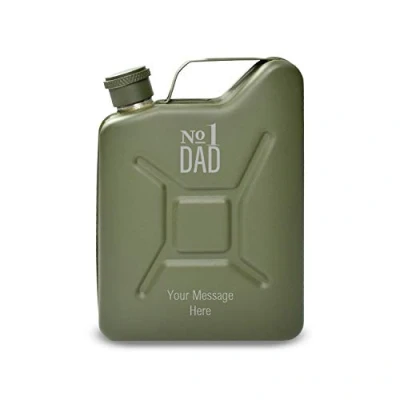 Personalised Engraved Green Jerry Can Hip Flask with No.1 Dad Design, Personalise Any Message