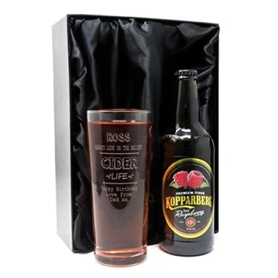 Personalised Engraved Pint Glass & Cider Bright Life Design (Kopparberg Raspberry Cider, Silk Lined Gift Box)
