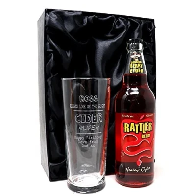 Personalised Engraved Pint Glass & Cider Gift Set Bright Life Design (Rattler Berry Cornish Cider, Silk Lined Box)