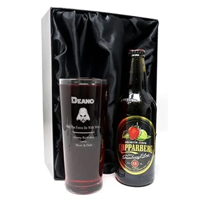 Personalised Engraved Pint Glass & Cider Gift Set Darth Vader Star Wars Design (Kopparberg Strawberry Lime Cider, Silk Lined Box)