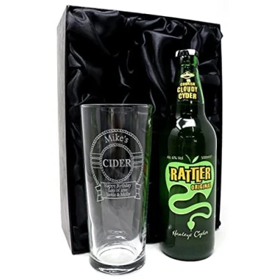 Personalised Engraved Pint Glass & Cider Gift Set Design (Rattler Original Cornish Cider, Silk Lined Box)
